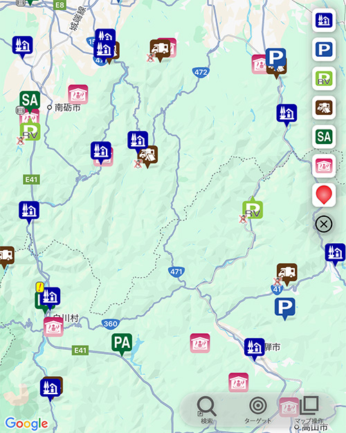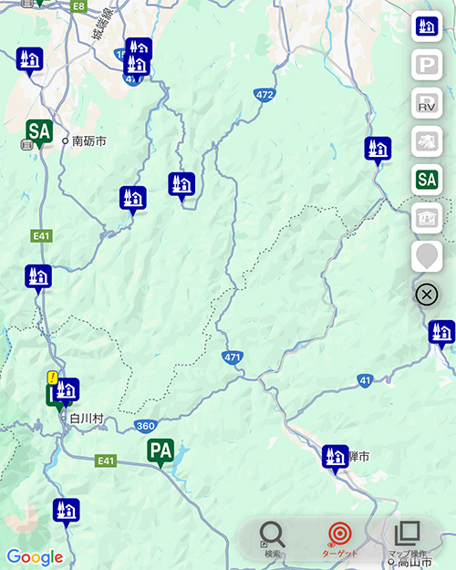 目的地点のマーカーが配置されます。 - 公式サイト:各高速道路会社や公団などの、SAPA施設ページへのリンクです。